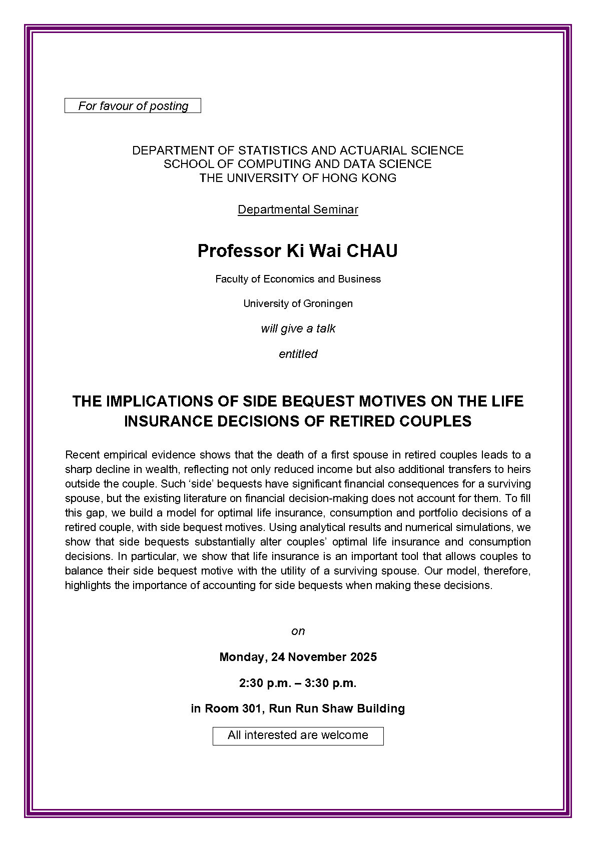 | The Implications of Side Bequest Motives on the Life Insurance Decisions of Retired Couples | Prof. Ki Wai Chau | November 24, 2025 2:30 pm - 3:30 pm |